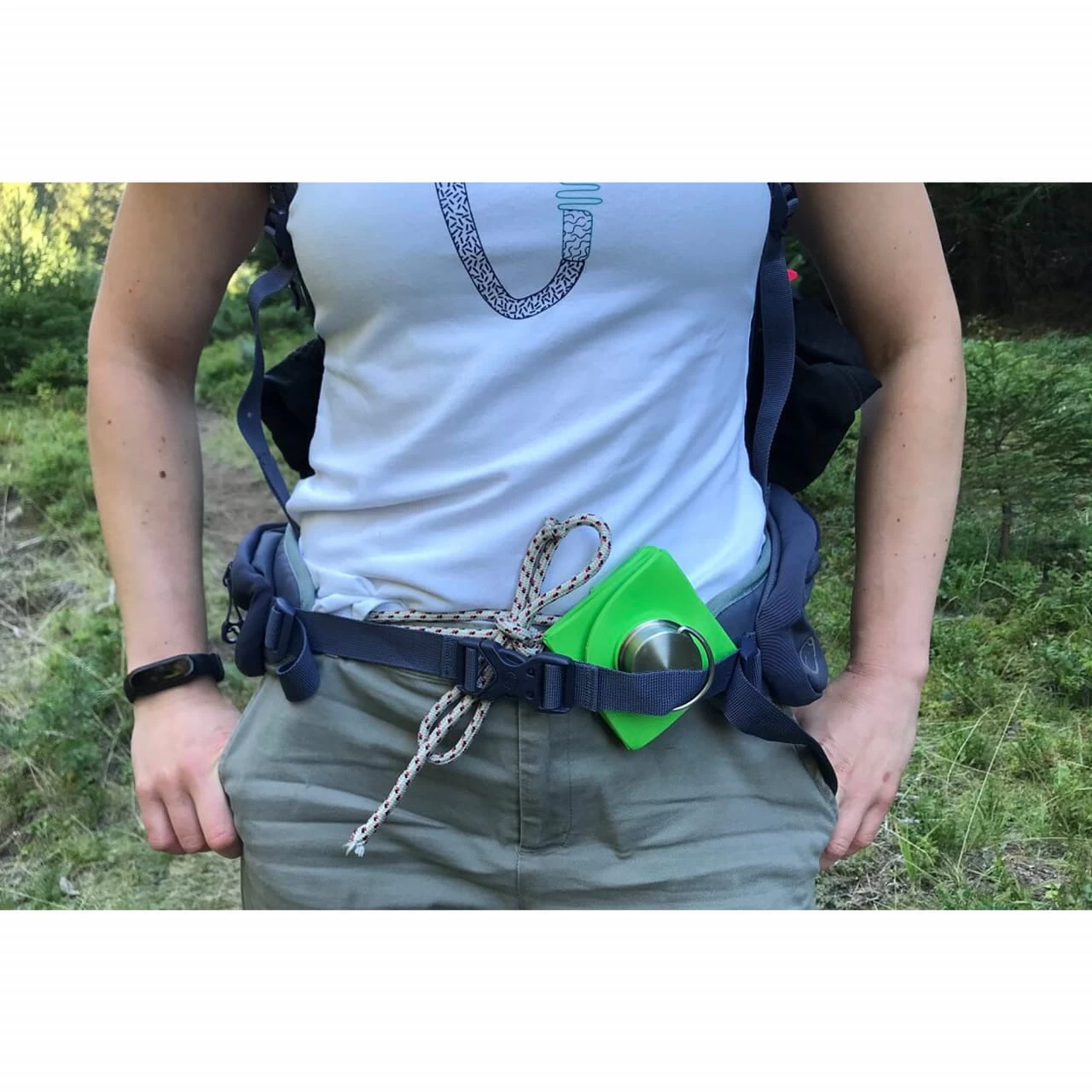 Der Deckel verfügt über einen Bügel, mit dem man die Trinkflasche z. B. an einem Rucksack befestigen kann. So bleibt im Rucksack mehr Platz für andere Dinge.
