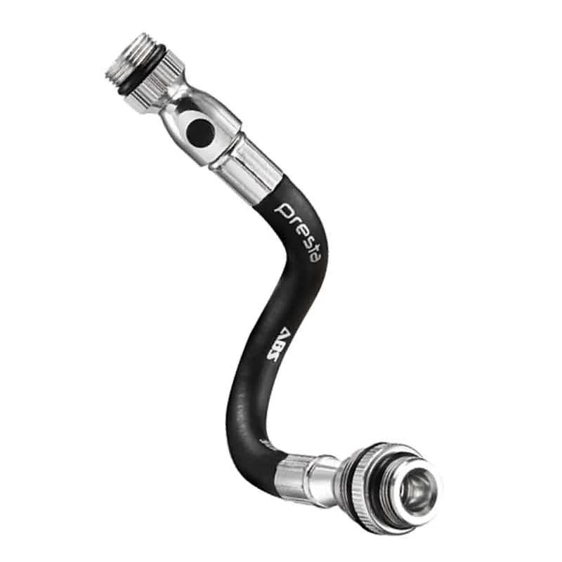 Der ABS Flexschlauch wird einfach auf das Ventil geschraubt (Prestaventil). Er hat einen ABS-Knopf, mit dem Luft abgelassen werden kann.