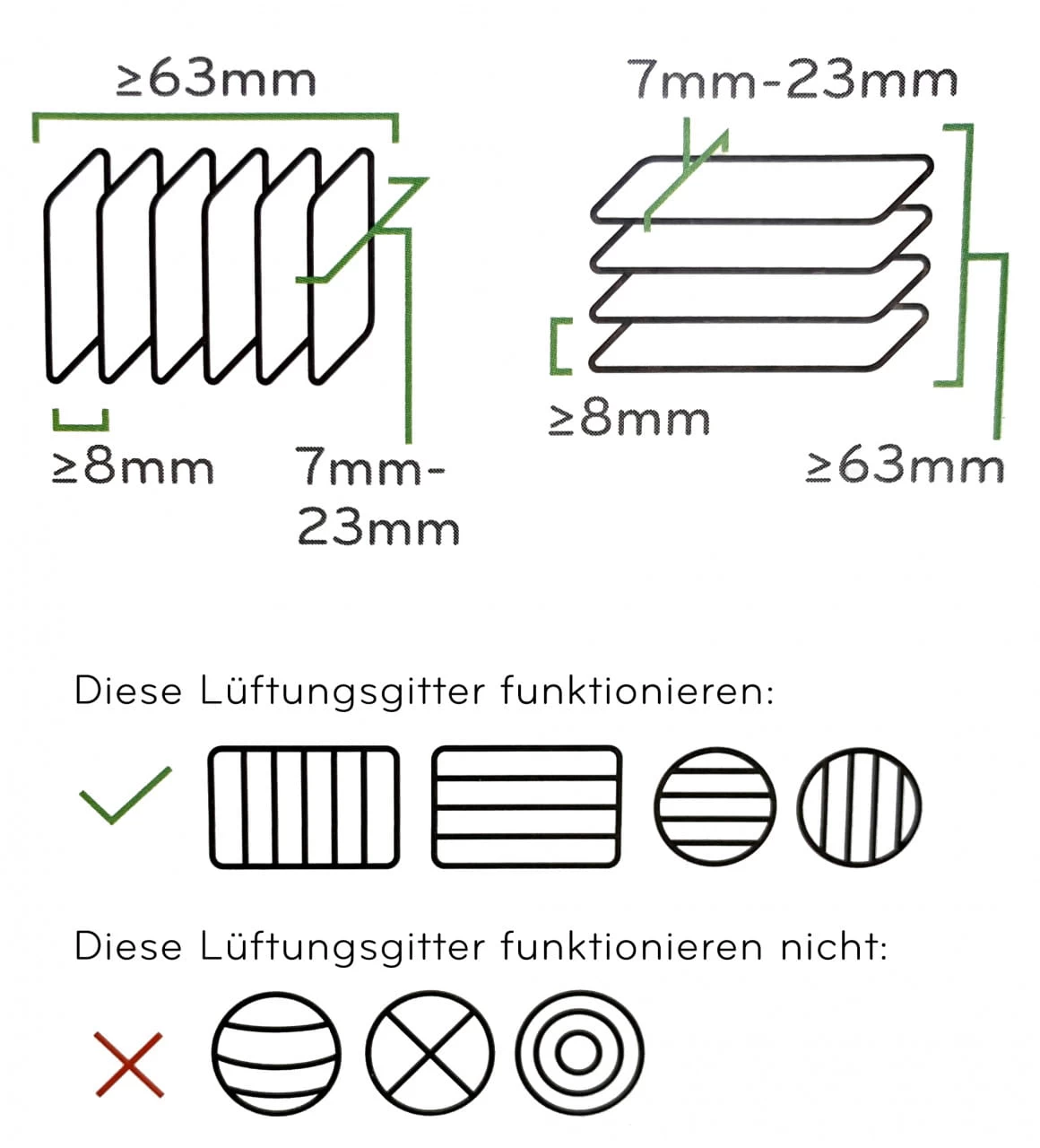 Damit die Halterung optimal funktioniert, müssen die Lamellen des Lüftungsgitters folgende Voraussetzungen erfüllen: