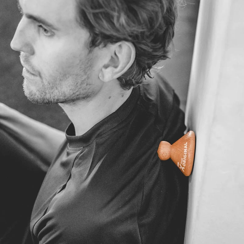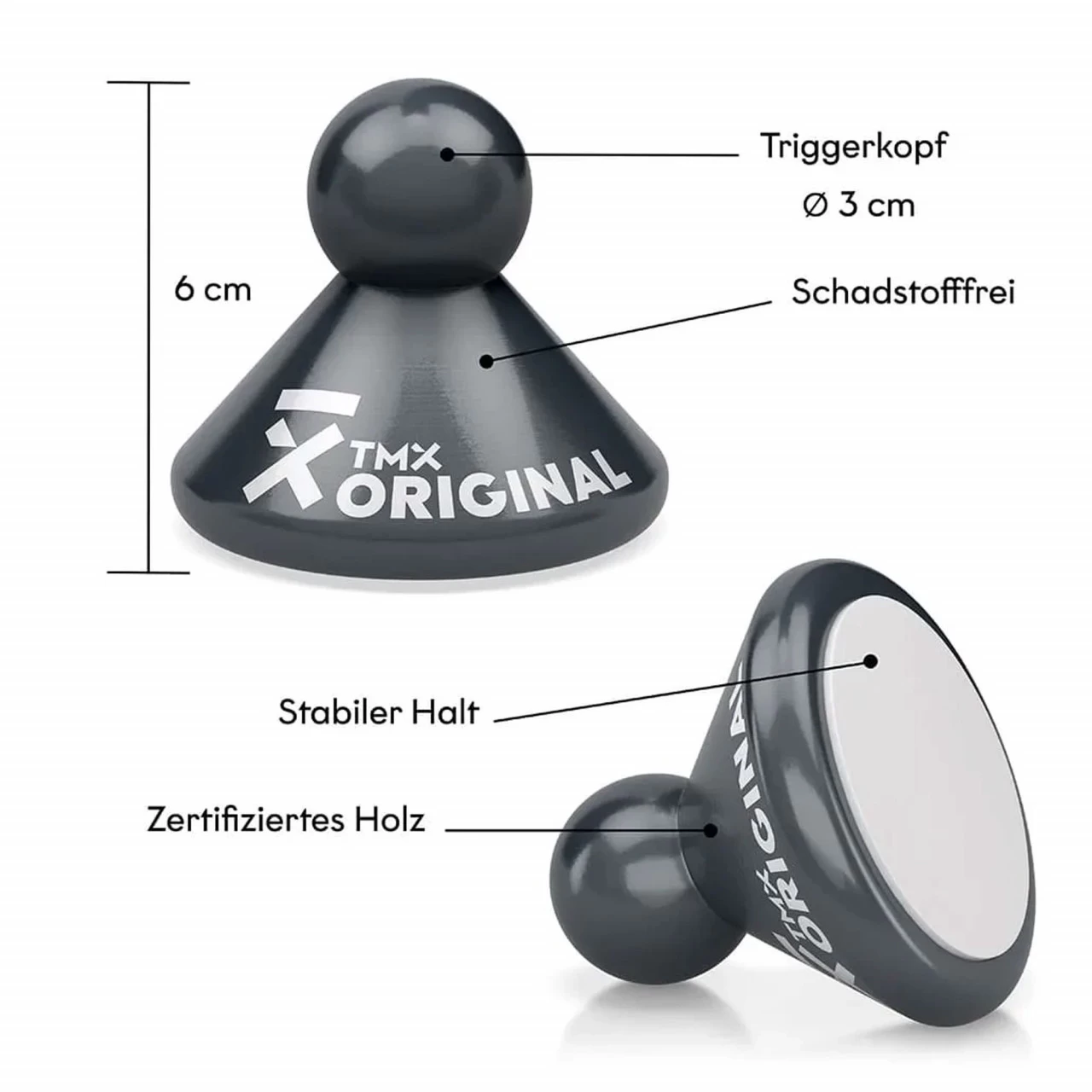Hier setzt der TMX-Trigger an, mit dem du punktgenau und zielgerichtet selbst behandeln kannst -zertifiziert und nach medizinisch-therapeutischen Grundlagen entwickelt. Über die Triggerpunkte kann ein tiefer, punktuell zielgerichteter Druck auf das Gewebe erfolgen. Der TMX-Trigger ist ein kegelförmiger Körper – die stabile Grundplatte kann zum Beispiel an einer Wand abgestützt werden. Der runde “,Kopf˜ mit 3 cm Durchmesser ist der eigentliche Trigger, den du am Druckpunkt ansetzt. Durch diesen zielgerichteten, genau platzierbaren Impuls kannst du die tief liegenden myofaszialen Verspannungen im Fasziensystem erreichen und lösen. Die Faszien umhüllen wie ein Netz alle Muskeln und Organe, schützen sie und verleihen dem Körper Halt. Dieses “,fasziale Netz˜ existiert auch in den Sehnen, Muskeln und Gelenken. Wenn sich dieses flexible Gewebe verklebt, entstehen die schmerzhaften Verspannungen. Fehlbelastungen, ständiges Sitzen im Büro, hartes Training oder verklebte Faszien können Triggerpunkte verdicken, was wiederum zu schmerzenden Verspannungen im gesamten Körper führt. Mit den TMX-Triggern kannst du Schmerzbereiche am Körper gezielt behandeln und somit eine schnellere Regeneration des Gewebes fördern.